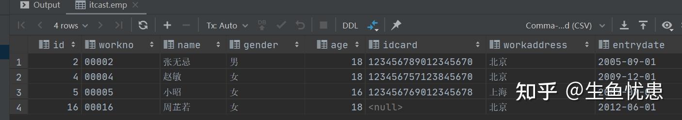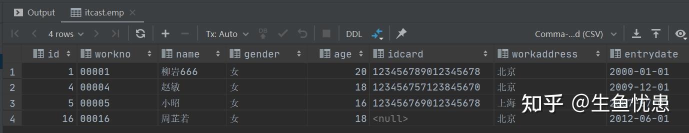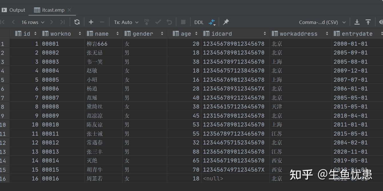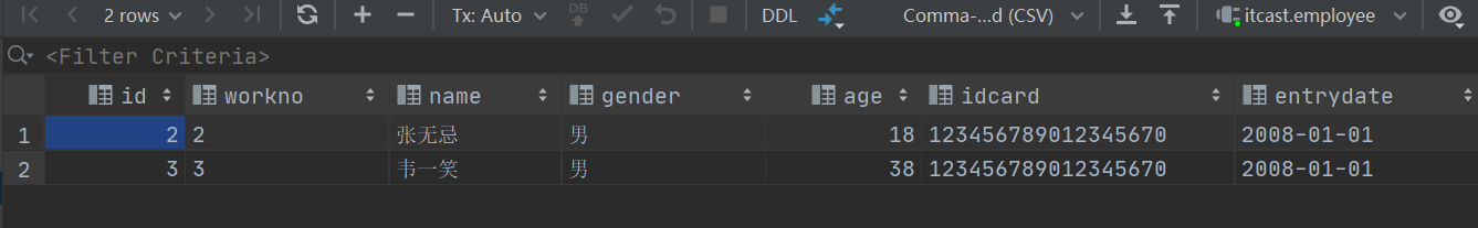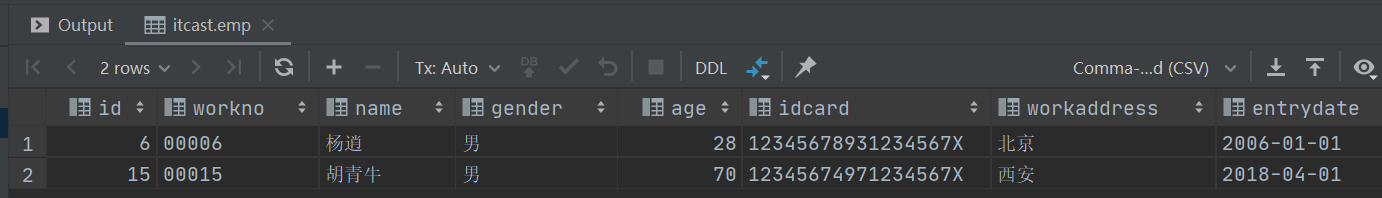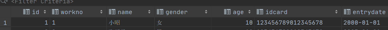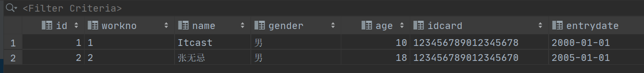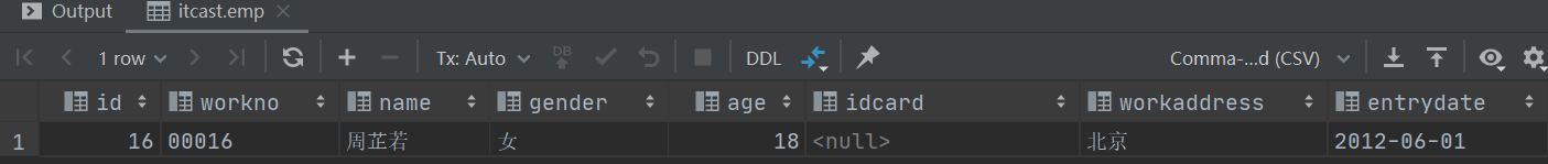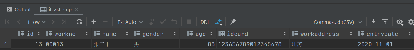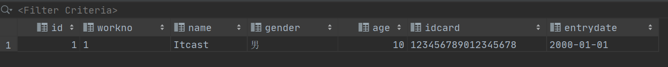 values(1,'1','Itcast','男',10,'123456789012345678','2000-01-01');
