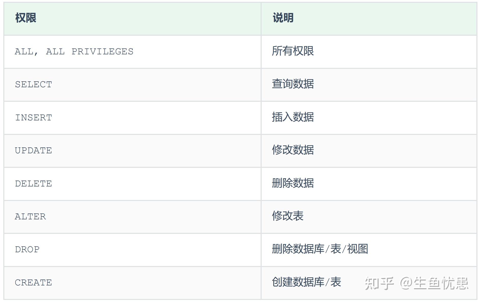 MySQL中定义了很多种权限,但是常用的就以下几种: