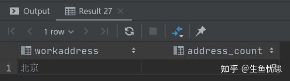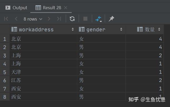 select workaddress, gender, count(*) &#39;数量&#39; from emp group by gender, workaddress;