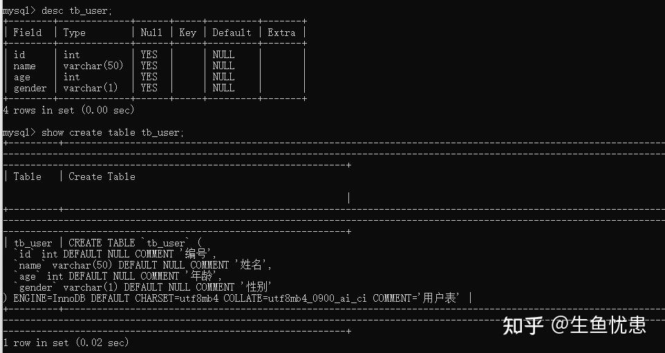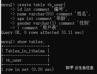 ) [ COMMENT 表注释 ];比如在新创建的itheima数据库中创建一张表tb_user: