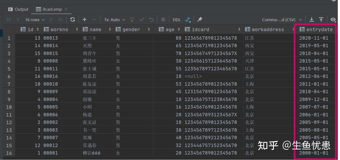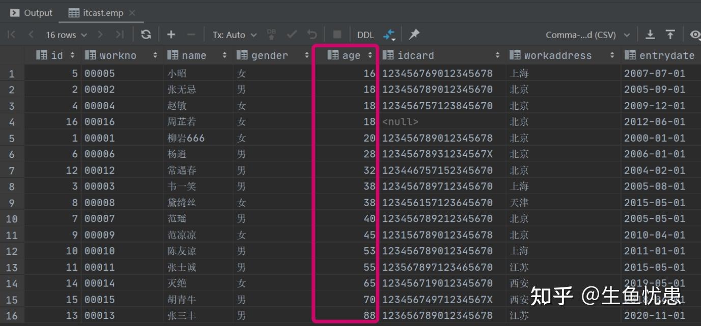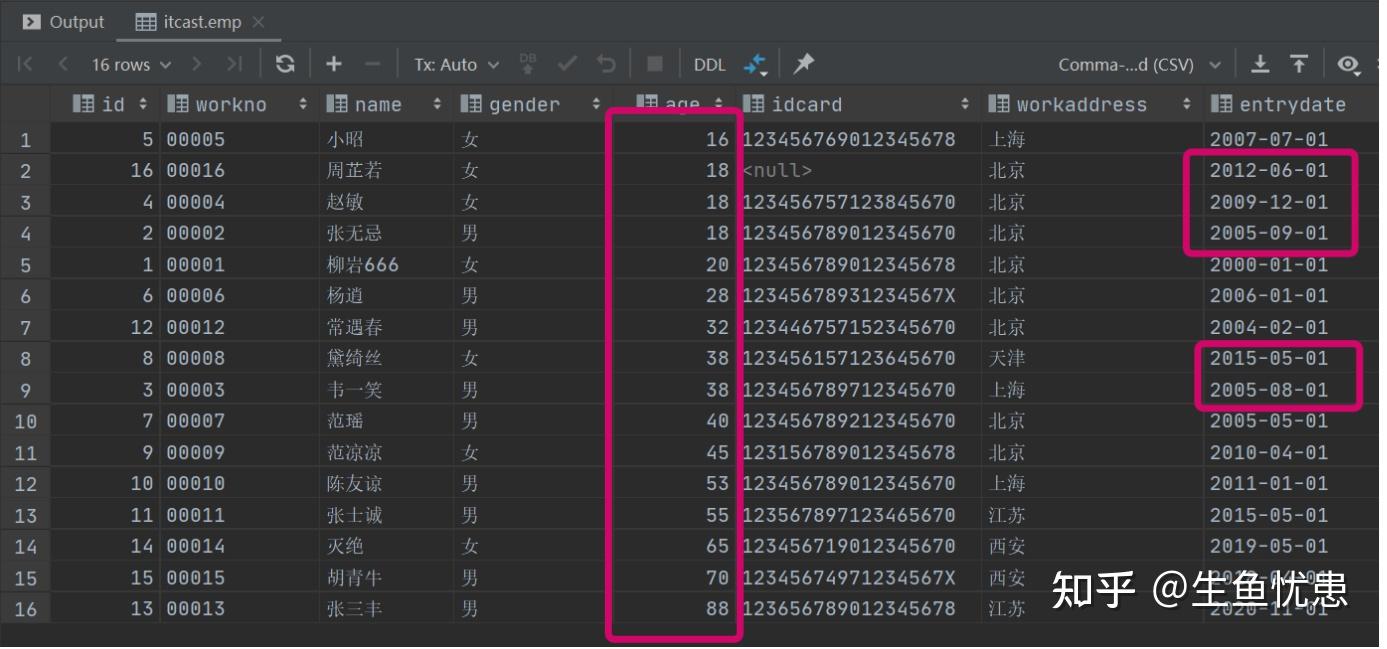 根据年龄对公司的员工进行升序排序,年龄相同,再按照入职时间进行降序排序: