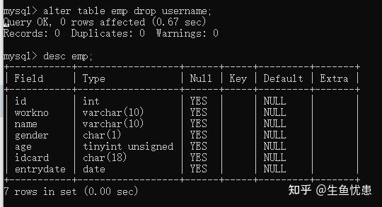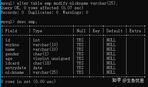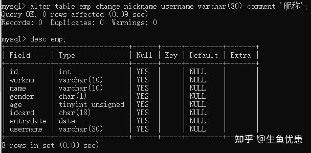 修改字段名和字段类型,将emp表的nickname字段修改为username,类型为varchar(30)