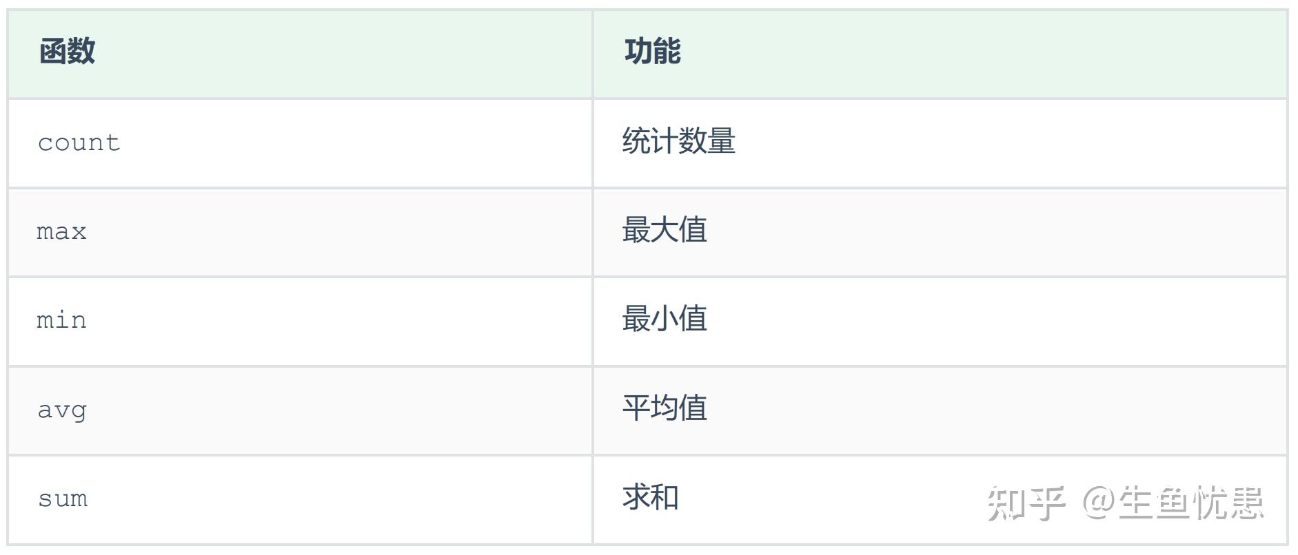 聚合函数将一列数据作为一个整体,进行纵向计算,语法为: