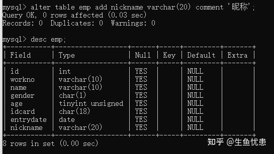 添加字段,为emp表增加一个新的字段”昵称”为nickname,类型为varchar(20)