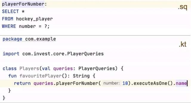 在 API 的设计上,SQLDelight 更是一骑绝尘,它使用 Kotlin 官方尚未正式发布的技术 Kotlin Compiler Plugin(后简称 KCP)来构建 API。用户只需要在一个特殊的 .sq 文件中编写自己的 SQL 语句,并给 SQL 语句起一个名字,KCP 就可以在工程编译构建时对 SQL 语句进行语法检查及静态类型校验,并生成一个函数。用户直接在 Kotlin 代码中调用该函数即可完成 CRUD 操作。SQLDelight 示例代码如下图所示: