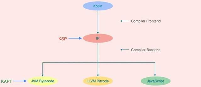 Kotlin Symbol Processor(后简称 KSP)是 Google 开发的元编程工具,基于前文所说的 KCP。它通常被用于注解处理及代码生成,它的功能虽然不如 KCP 强大,但拥有较为完整的教程与文档且更加易用。在 KSP 诞生之前,开发者通常使用 KAPT 来进行注解处理和代码生成,但其二者处理 Kotlin 的阶段不同,如下图所示: