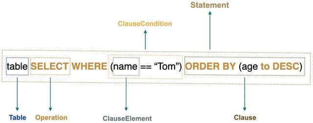 statement = table SELECT WHERE (name EQ &#34;Tom&#34;) ORDER_BY (age to DESC)