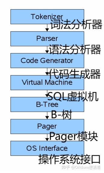 它的后端自然就是:SQL虚拟机、B-树、Pager模块、操作系统接口。这一部分有点复杂,我们拆开来说: