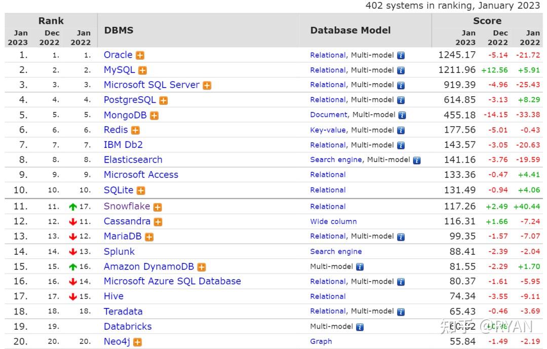 DB-Engines 是全球知名的数据库流行度排行榜网站,其评选年度数据库的标准为:计算数据库当前最新流行度分数(2023 年 1 月)的同比增长量,分数增长最多的即为年度数据库。