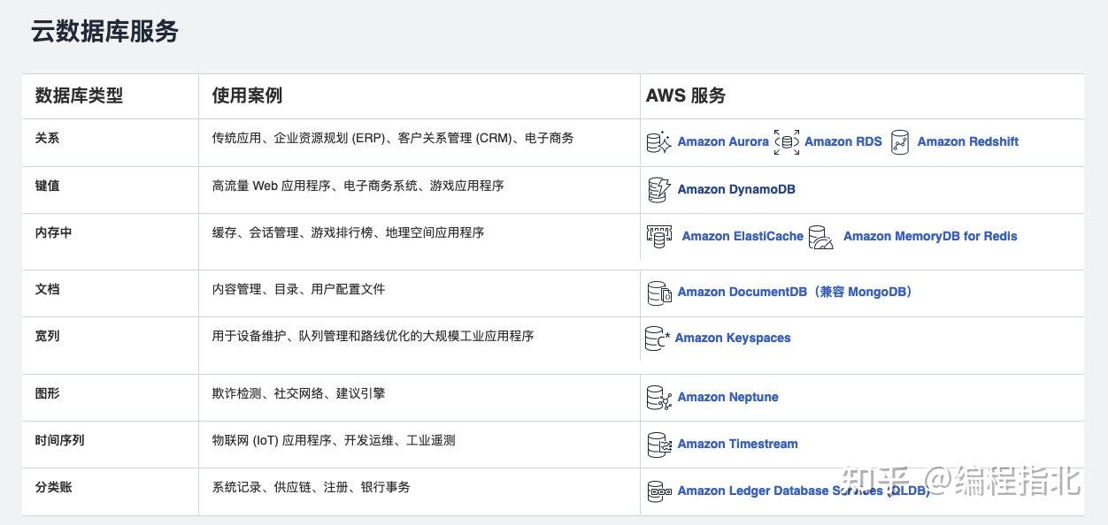云原生数据库有很多适合不同场景的类型,比如关系型、键-值、文档型、时间序列、图数据库等,可以根据自己的业务需求进行选择,这里从 Amazon 官网截取了一些云数据库服务: