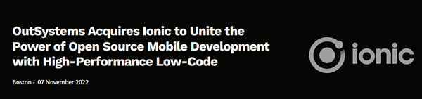 宣布收购开源移动应用厂商Ionic,进一步提升软件开发能力。OutSystems表示收购Ionic完成后,其将继续保持独立部门存在,但一些列产品会集成在OutSystems的低代码平台中。